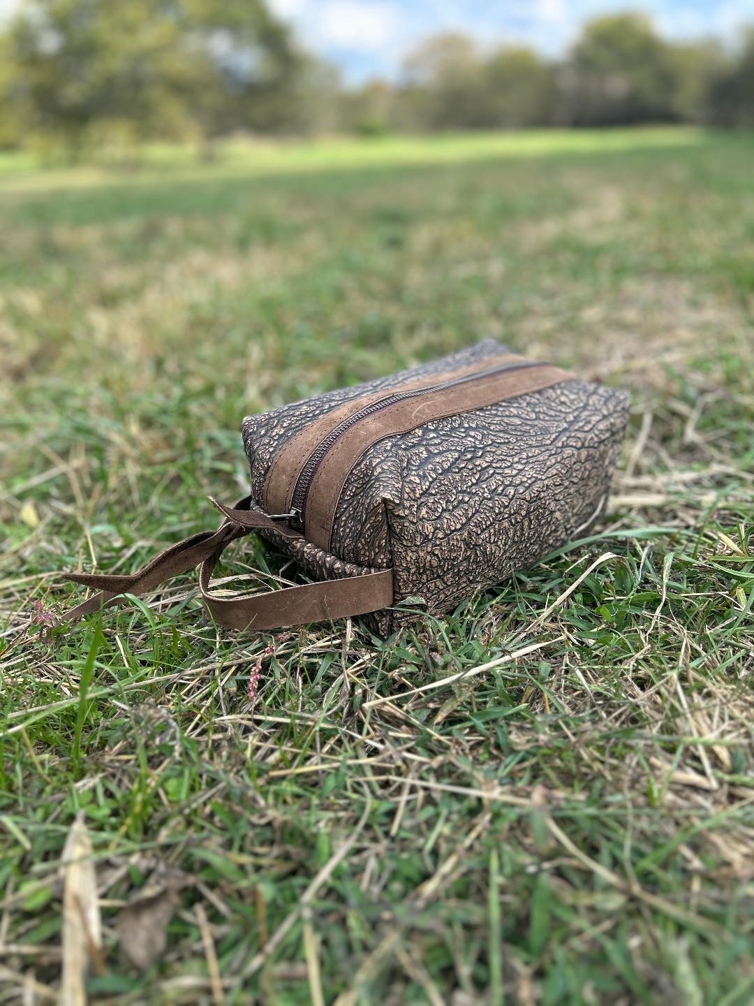 The body of this bag is made of Elephant Print cow hide and trimmed with Brown Oil Tan.